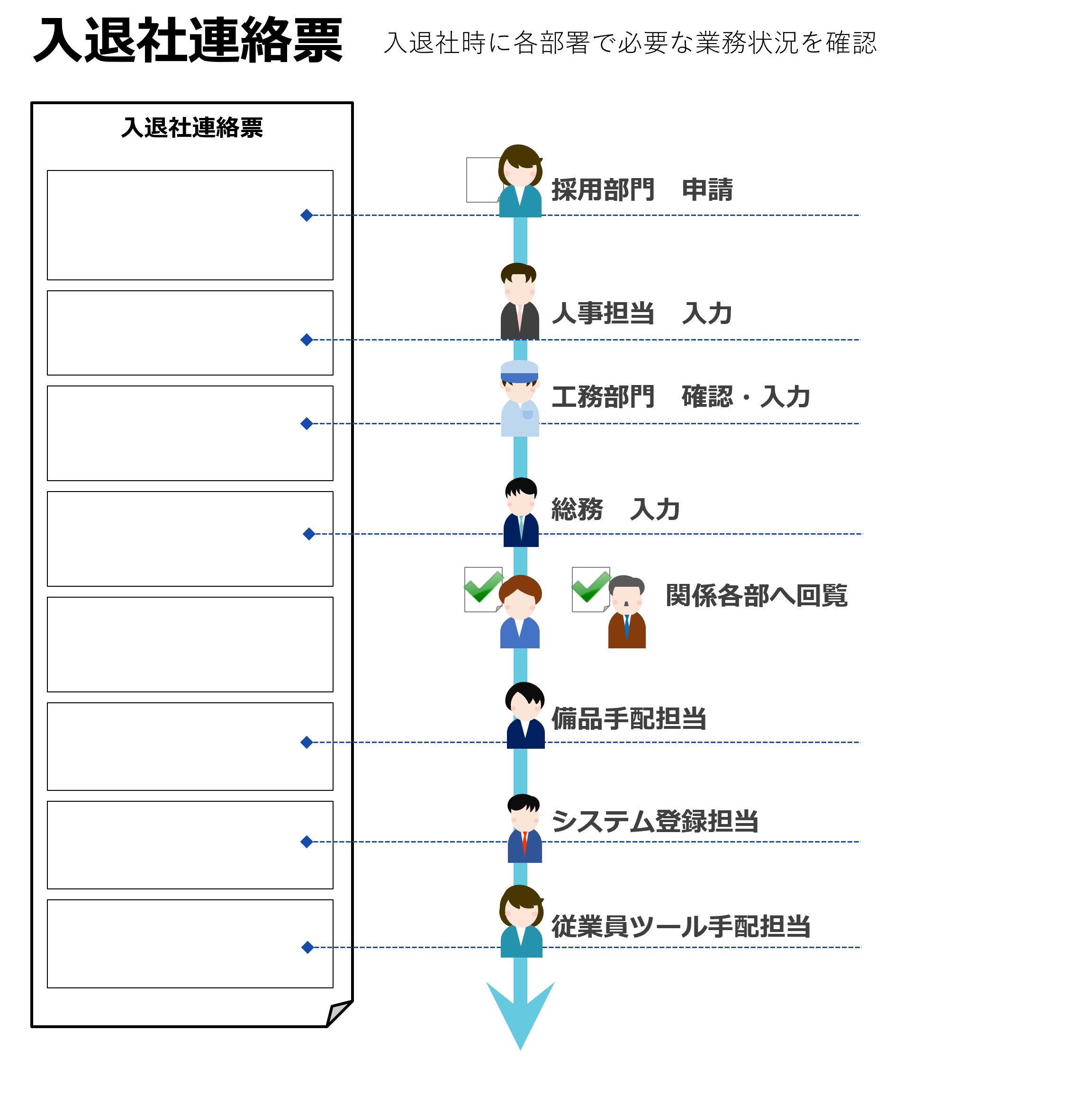 入退社時の各部署の業務状況を一つの帳票で確認できるようにしています 。