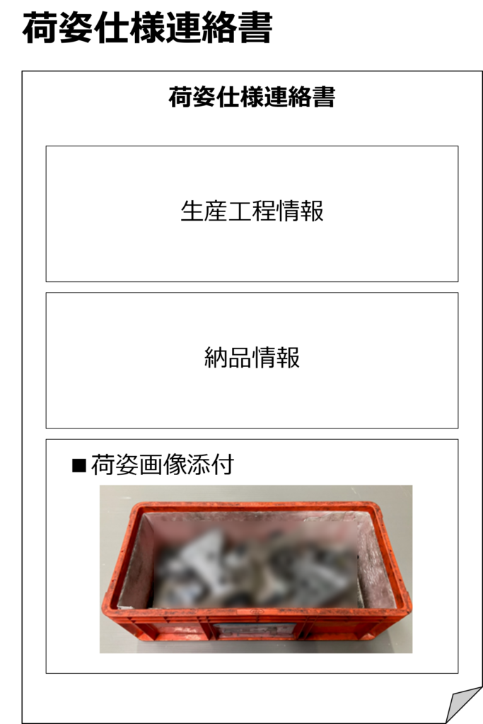 その取り決めた内容を関係部署で共通認識するために「荷姿仕様連絡書」を運用しており、こちらには画像パーツを活用しており、荷姿の写真を添付し、わかりやすく共有できる仕組みにしています。