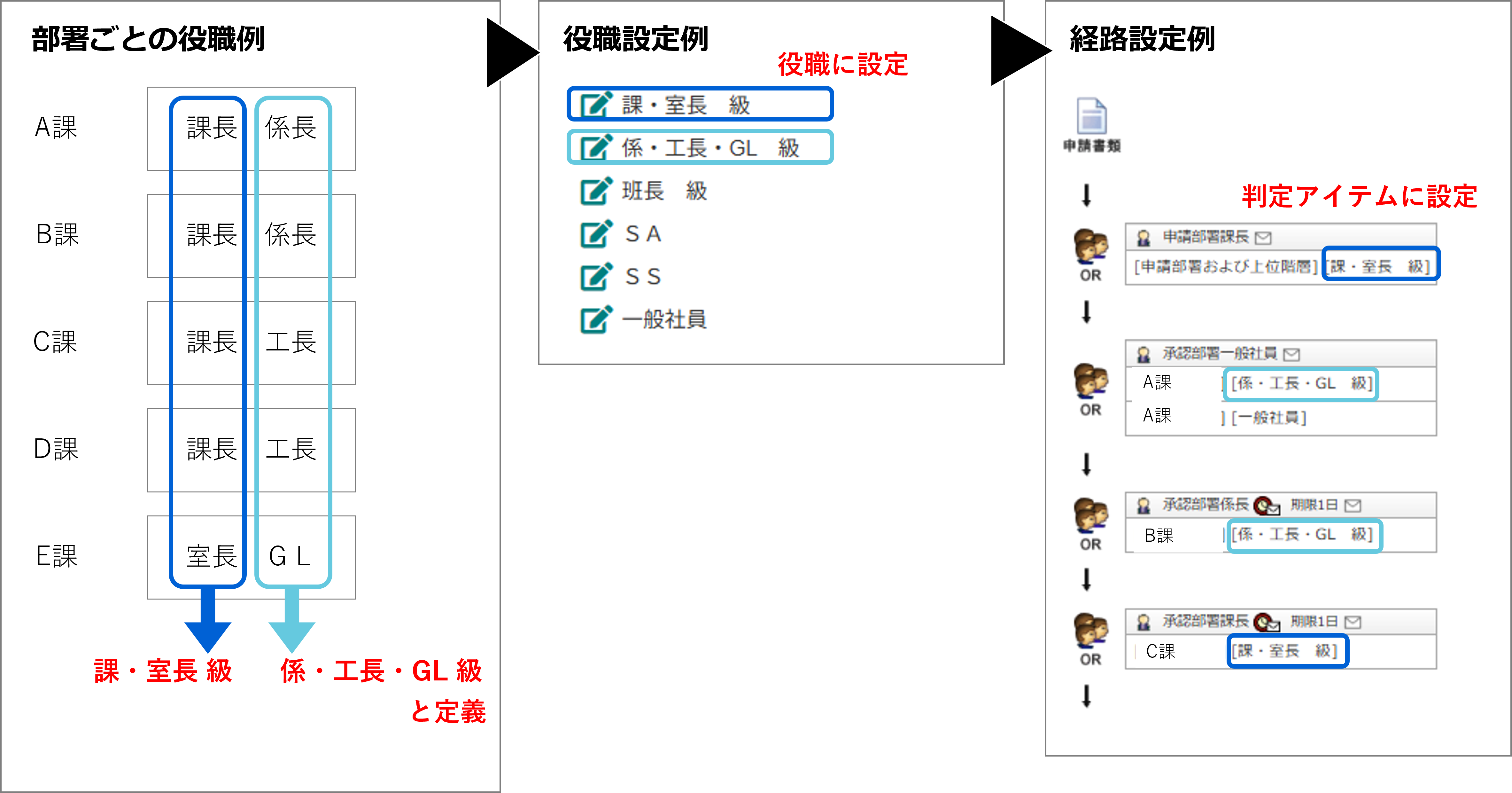 組織と経路設定については、役職の設定を工夫しています。