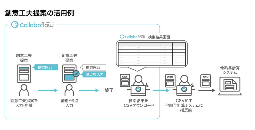 他にも、日常業務における改善提案を提出し、その結果によって賞金が給与に反映される「創意工夫提案」については、これまでは手作業による給与計算処理が必要で、かなりの工数がかかっていました。コラボフローでの運用に変更した結果、コラボフローから申請データをCSVでダウンロードして給与計算処理に一括反映できるようになり、作業工数削減と品質向上を実現しました。