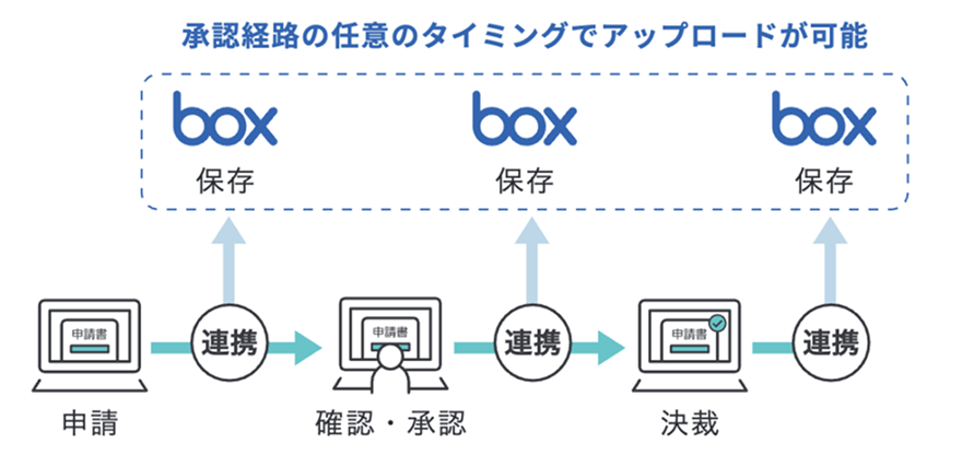 承認経路の各段階で Box へアップロードできるため、業務に応じて2つの運用が可能です。