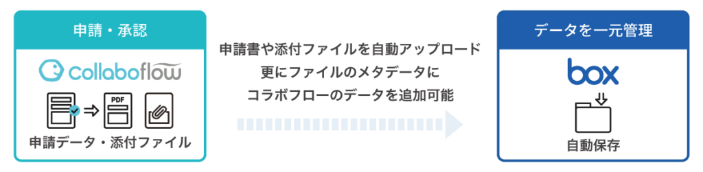 さらに、申請書の項目情報を Box のメタデータとして自動連携できるため、文書検索・分類・活用までを一気通貫で実現します。