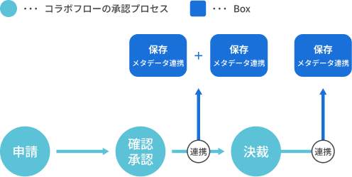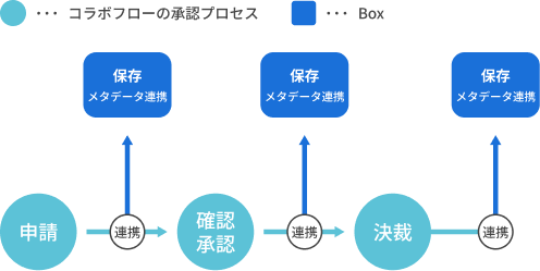 申請書の項目(例:案件名・部門・日付・金額など)を、 Box 側のメタデータに自動反映。