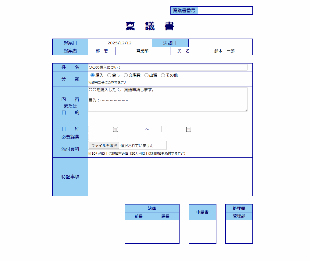 - 申請金額が一定額以上の場合のみ、見積書添付欄や特記事項の入力欄が表示される。