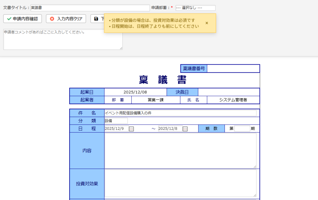 - 開始日より終了日を前にすると申請ができない。
