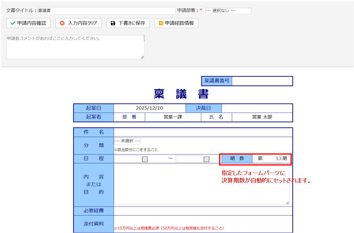 申請データに「決算期数」を自動でセット。