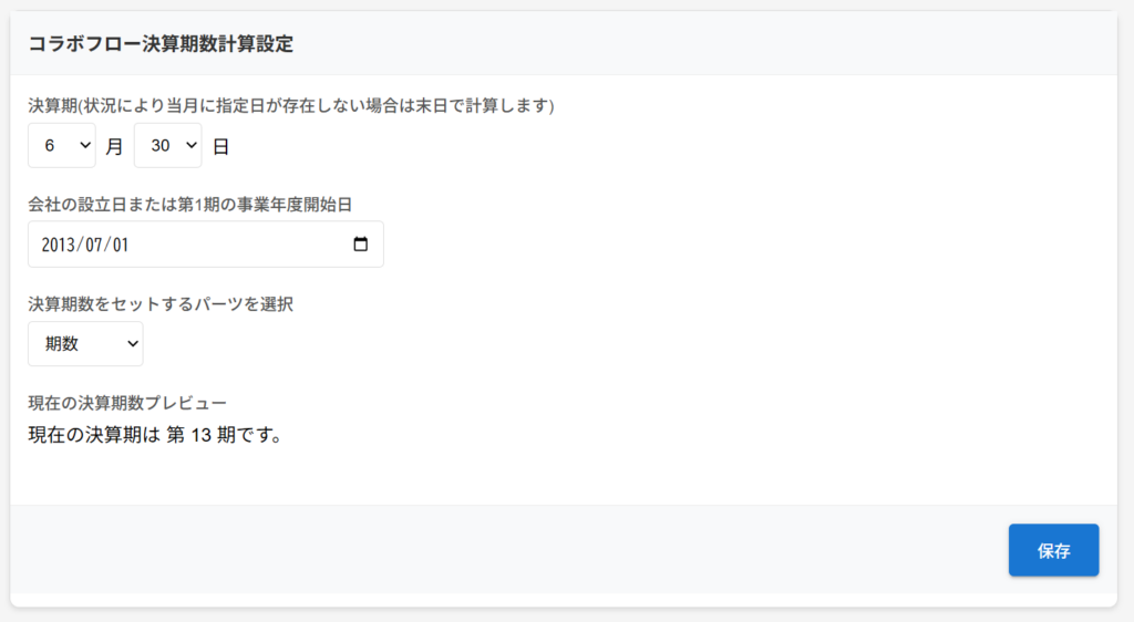 会社の設立日と決算期をプラグイン設定画面で登録しておくことで、申請日がどの決算期に属するかを自動で計算します。